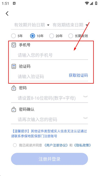 4、在注册信息页面,继续填写手机号、验证码对应的内容。