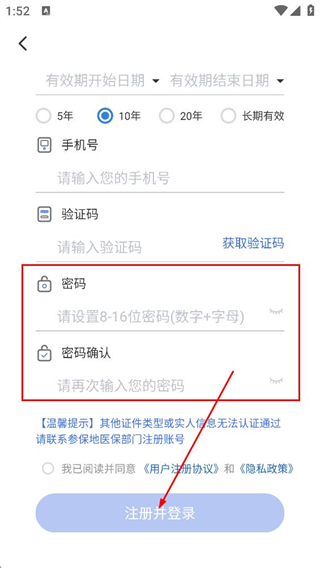 5、在注册信息页面,填写密码、密码确认,点击注册并登录,完成账号注册。