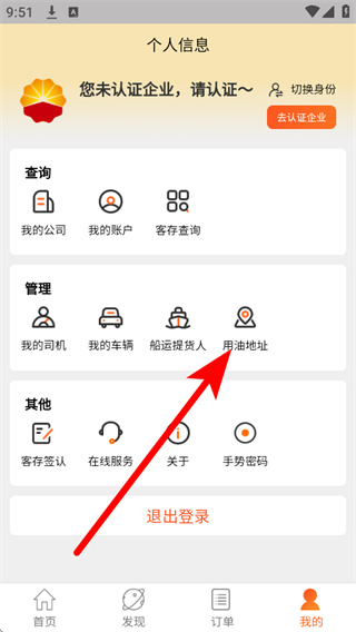 2、在个人信息页面中,找到并点击用油地址,进入用油地址管理页面。
