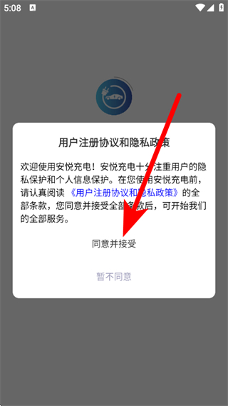 1、打开安悦充电桩,在弹出提示框,点击同意并接受,进入首页。