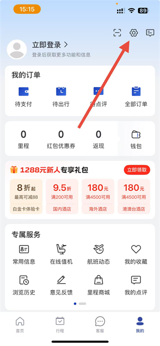 1、在艺龙旅行我的界面,找到右上角的设置图标并点击,进入设置页面。