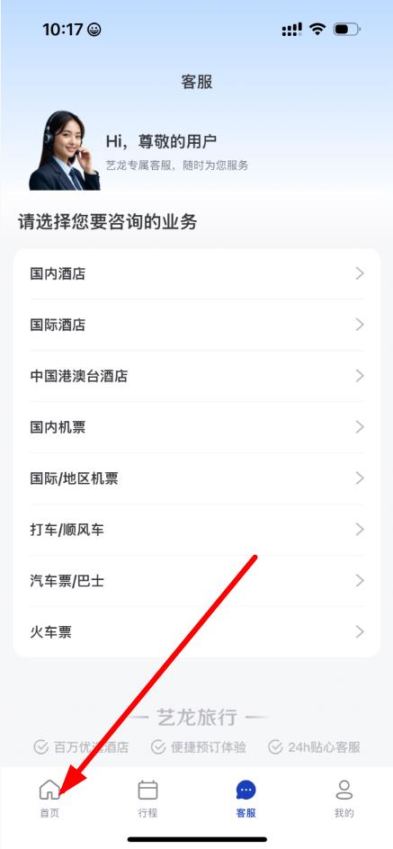 1、打开艺龙旅行app,点击底部首页图标进入首页界面。