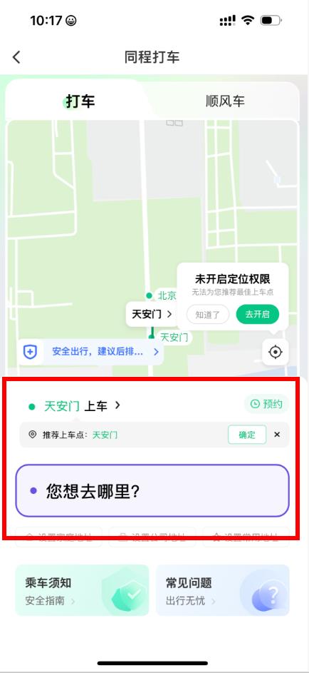 3、进入打车页面后系统会自动定位,若未开启定位权限需手动设置上车地点。