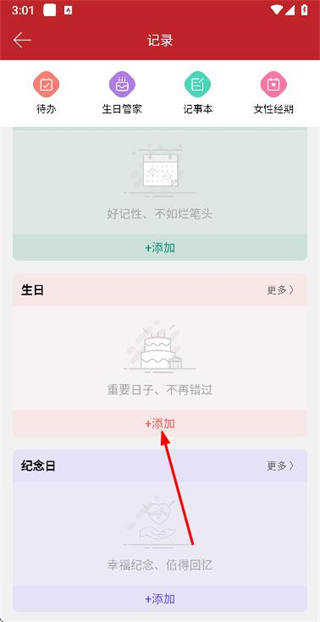 3、在记录页面的生日板块点击添加按钮,进入生日信息填写页面。