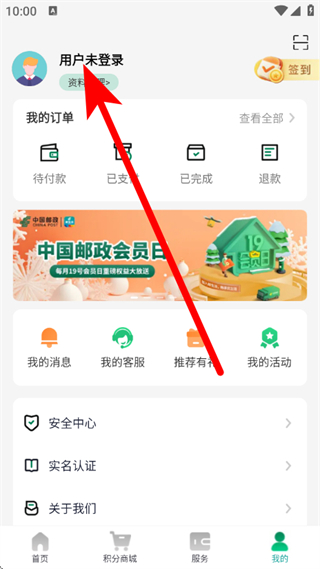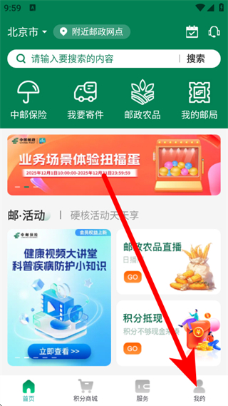 1、打开邮生活,点击底部的我的,进入我的页面。