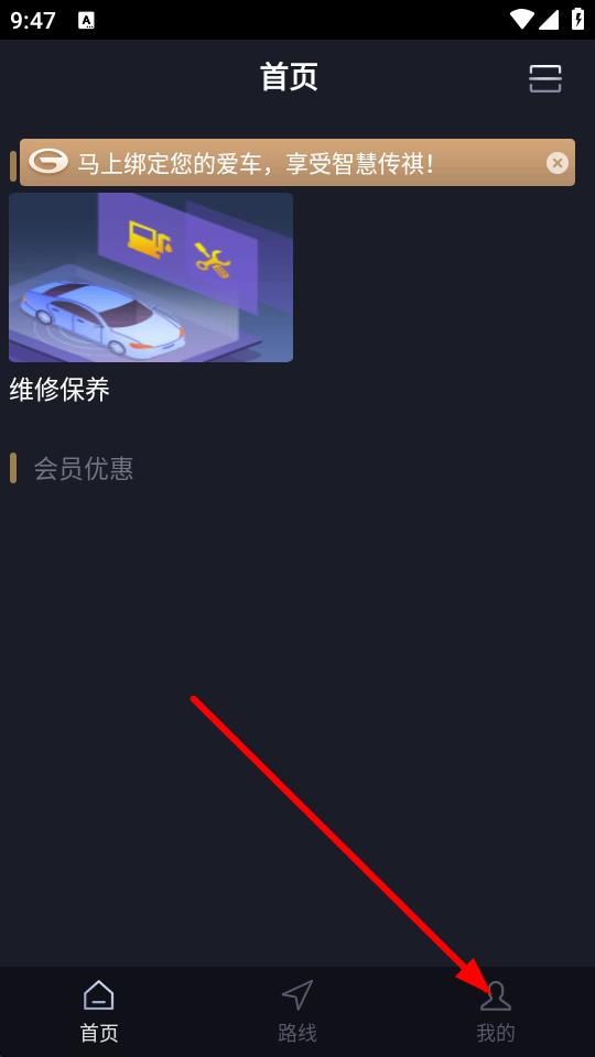 1、打开智慧传祺app,点击底部导航栏中的我的进入个人界面。
