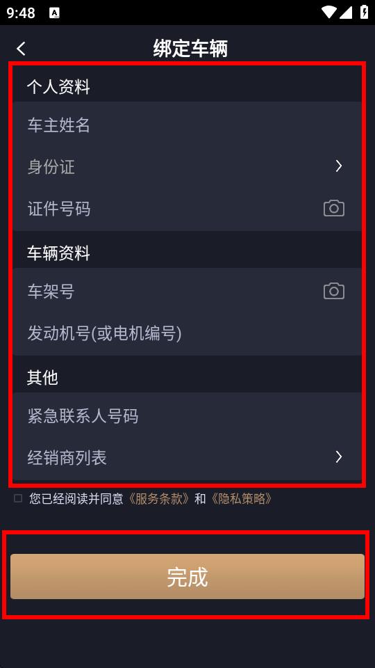 4、按要求填写个人资料、车辆资料以及其他信息,勾选同意相关服务条款和隐私策略后,点击完成,即可完成车辆绑定操作。