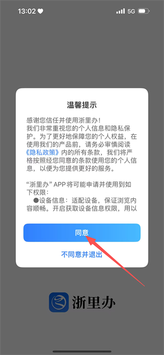 1、在浙里办的温馨提示弹窗中,点击同意,进入主页面。