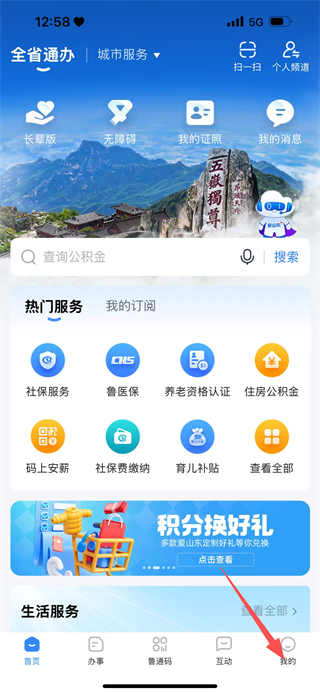 2、在爱山东主页面,点击底部的我的选项,进入登录页面的后续操作。