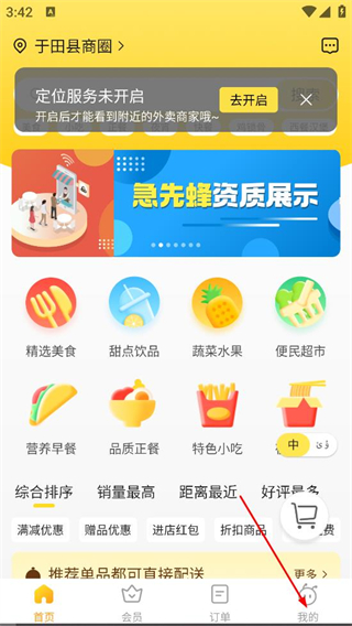 1、在急先锋外卖首页,点击底部的我的选项,进入个人页面。