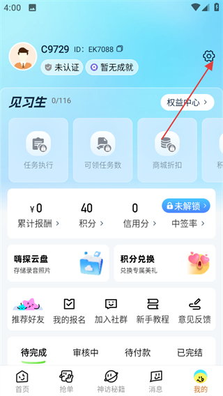 2、在个人中心页面,点击右上角的设置图标,进入设置中心页面。