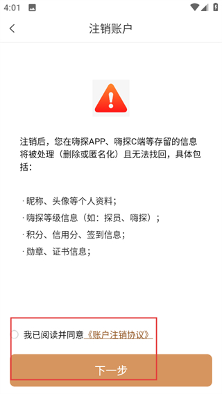 5、在注销页面,勾选协议后点击下一步,进入原因选择页面。