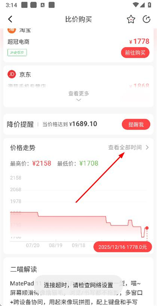 3、在比价购买页面下拉后点击查看全部时间选项,查看该商品的完整价格走势。