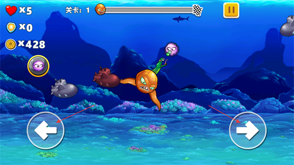 1、操控左右箭头移动八爪鱼,躲避障碍并靠近目标,积累金币,推进关卡进度。