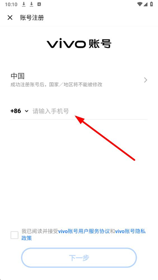 3、在注册界面,输入手机号并勾选协议,点击下一步按提示完成后续注册流程。