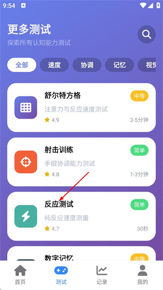 1、在反应测试首页,点击底部的测试选项,进入更多测试页面。