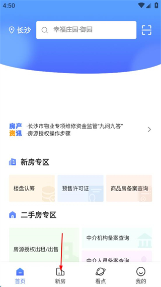 3、登录后找到首页的新房选项,点击新房。