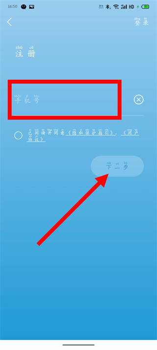 4、在注册页面,输入手机号,勾选后,点击下一步按钮。