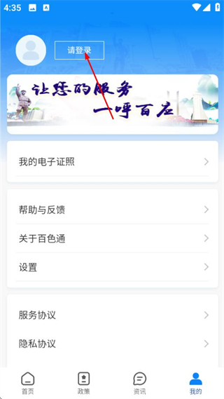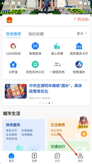 1、在百色通首页,点击底部我的选项,进入个人中心页面。