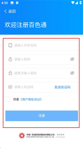 4、在注册页面,填写信息并勾选协议后点击注册按钮,完成账号注册。