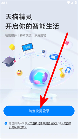1、打开天猫精灵,在启动页点击淘宝快捷登录,进入登录页面。