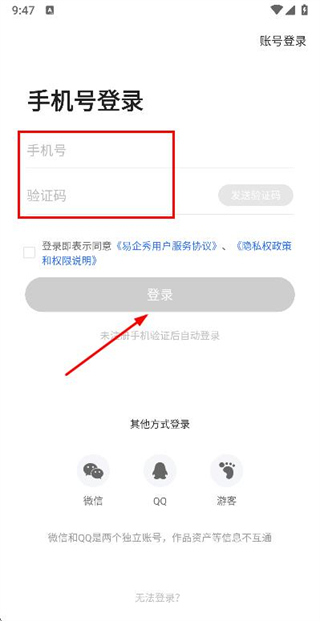 3、在登录页面填写手机号和验证码,勾选协议后,点击登录完成账号登录操作。