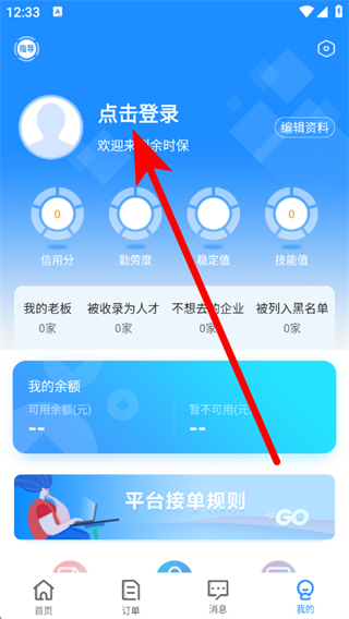 2、在个人页面,点击登录区域,进入登录注册页面。