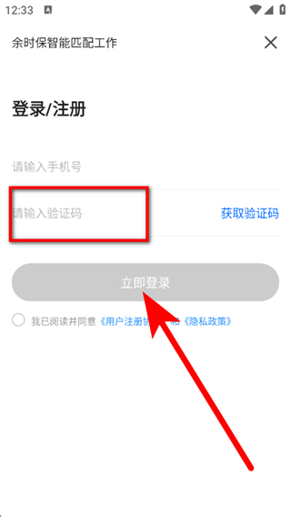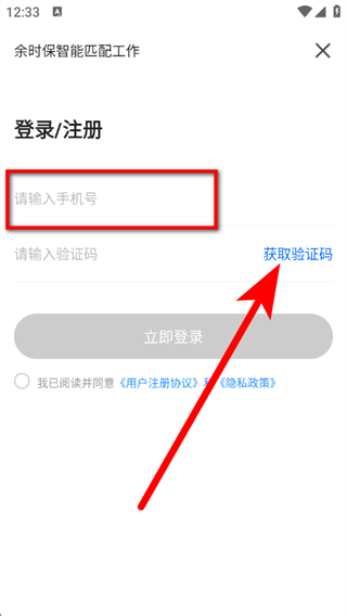 3、在登录注册页面,输入手机号,点击获取验证码。