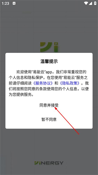 1、在易能云的温馨提示弹窗中,点击同意并接受,进入登录页面。