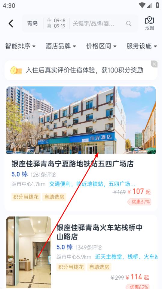 6、在搜索结果中,点击目标银座酒店,进入酒店详情页。