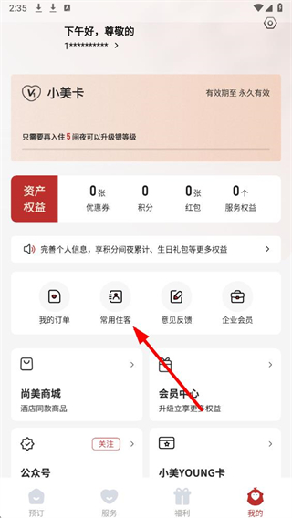 2、在个人中心页面,找到常用住客选项并点击,进入住客信息管理界面。