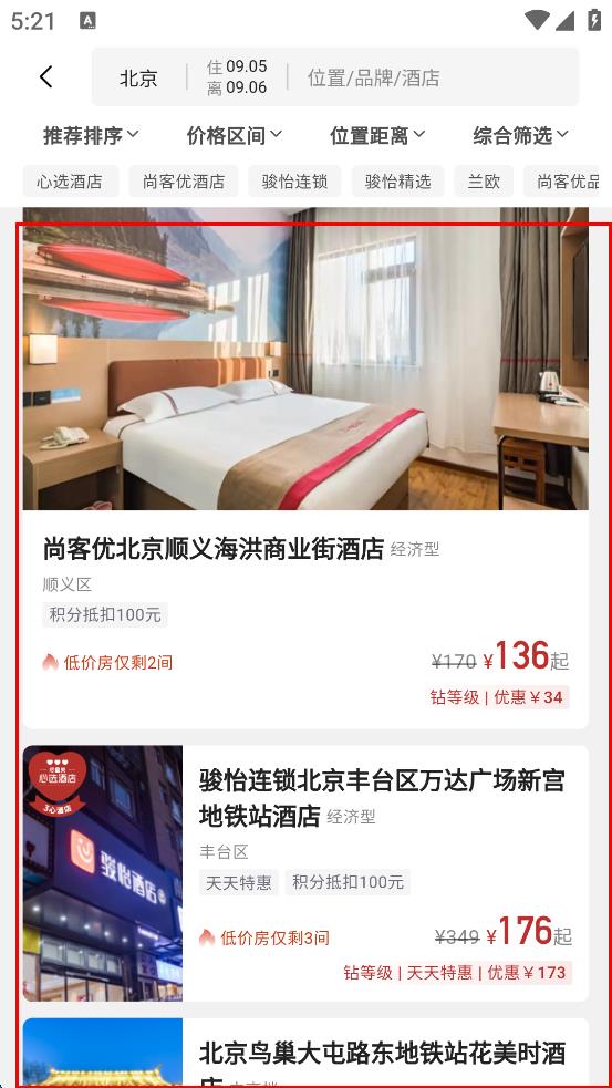 4、在酒店搜索结果页面,即可查看尚客优北京顺义海洪商业街酒店、骏怡连锁北京丰台区万达广场新宫地铁站酒店等北京的酒店信息。