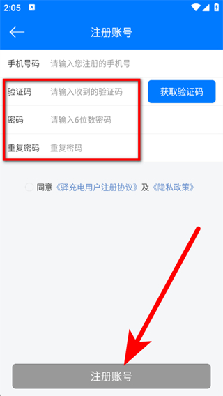 4、输入收到的验证码,设置密码,勾选相关协议后,点击注册账号,完成注册。