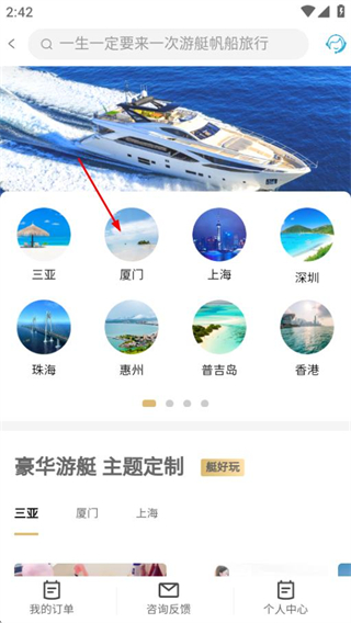2、在城市选择界面,选中厦门选项进入厦门游艇项目列表页面。