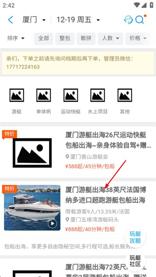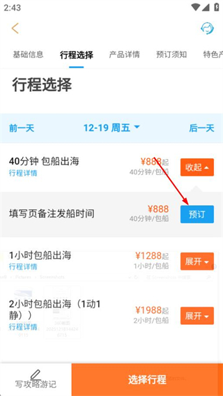 3、在项目列表页面,点击目标游艇项目进入行程选择页面。