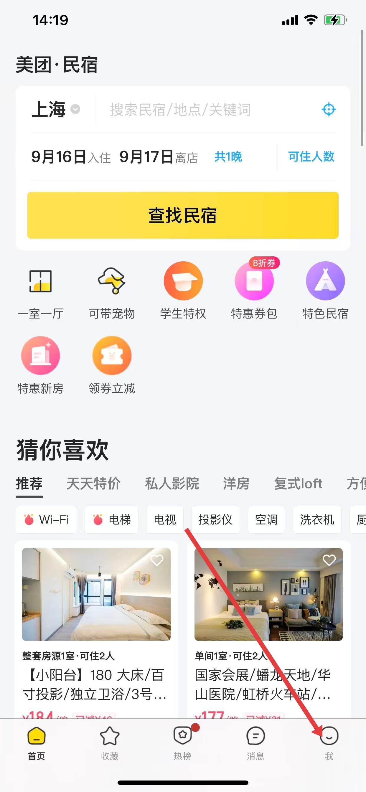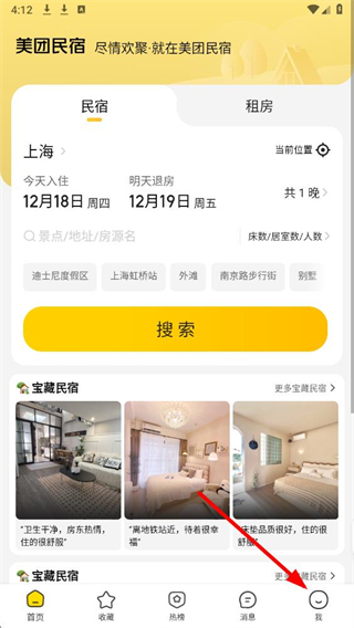1、在美团民宿app界面底部,找到我的选项并点击,进入个人中心页面。
