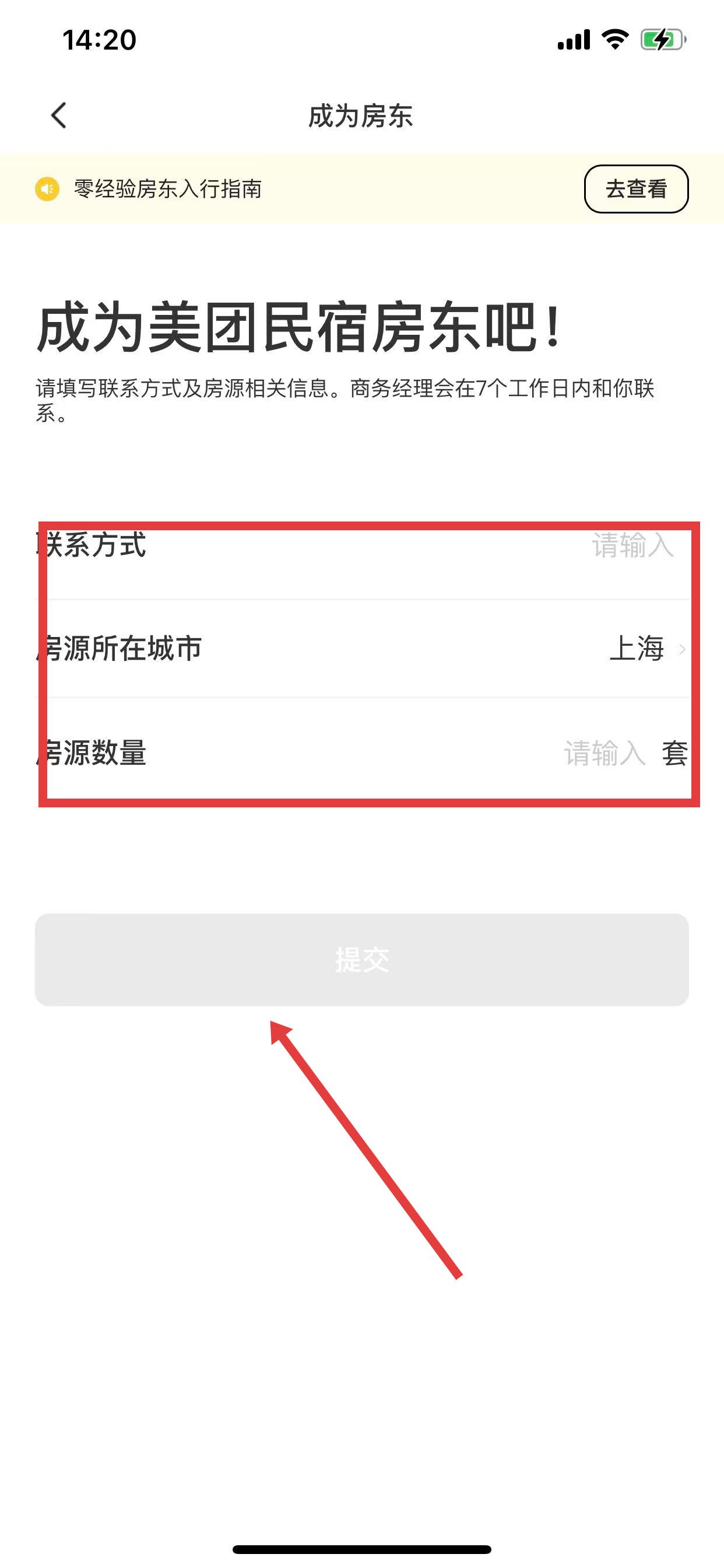 4、填写联系方式、房源所在城市、房源数量等相关信息,点击提交按钮,商务经理会在7个工作日内联系。