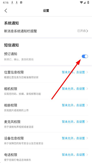 3、在设置页面中,找到短信通知板块下的预订通知选项,点击其右侧的开关按钮,即可关闭该通知。