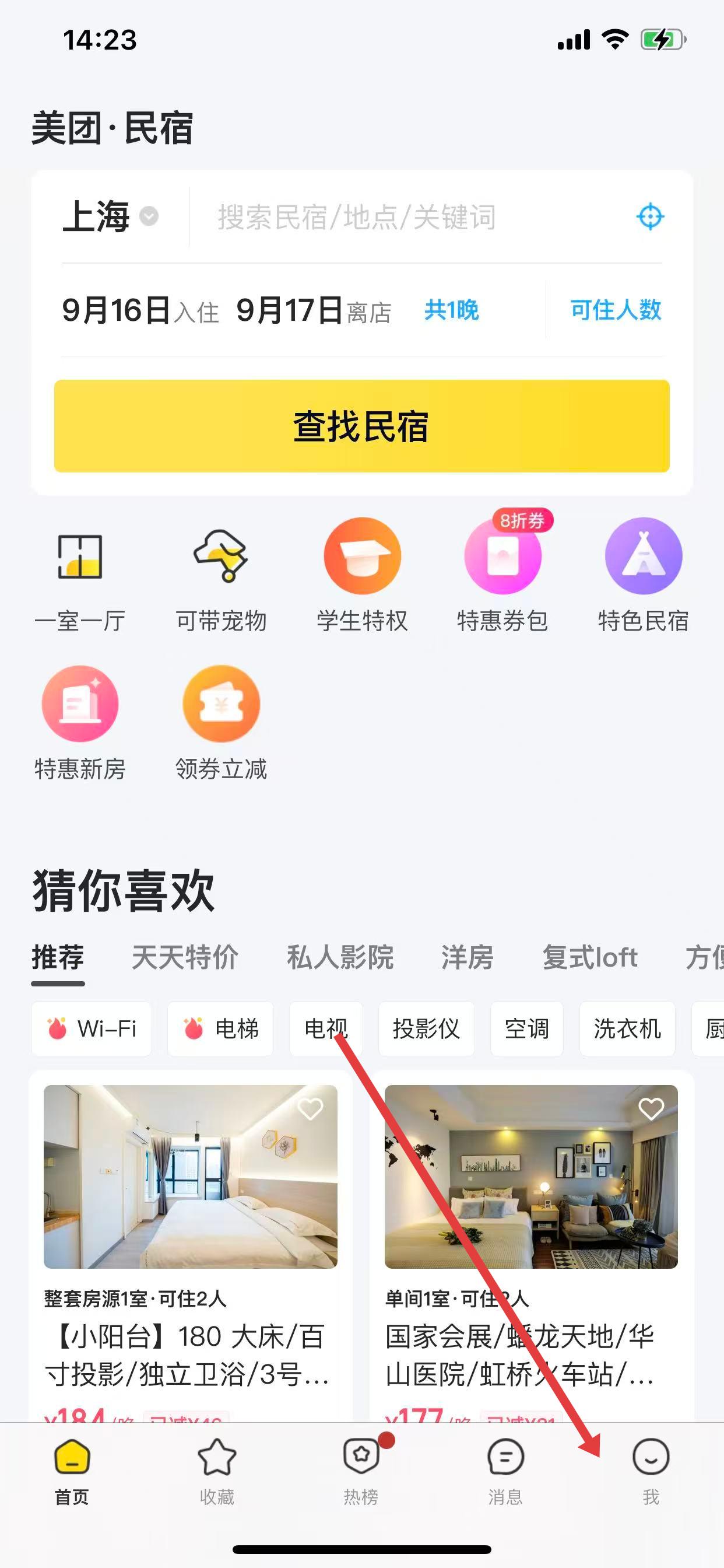 1、在美团民宿应用界面底部,找到我的选项并点击,进入我的页面。