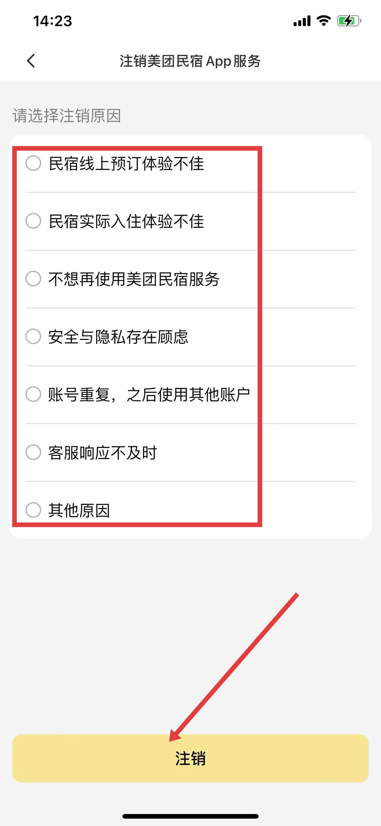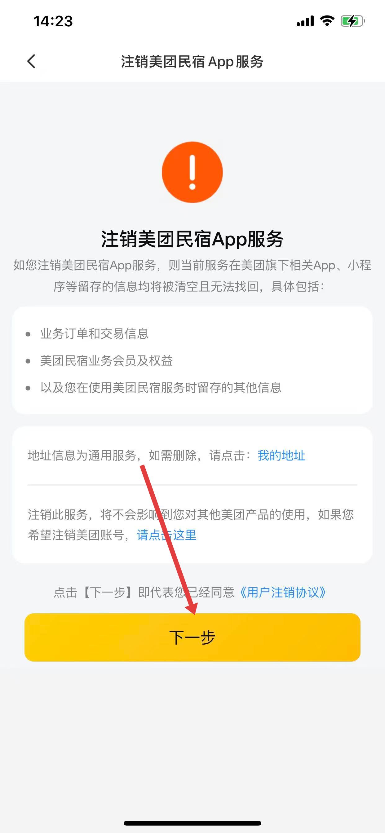 5、在注销美团民宿App服务页面,阅读相关提示信息后,点击下一步。