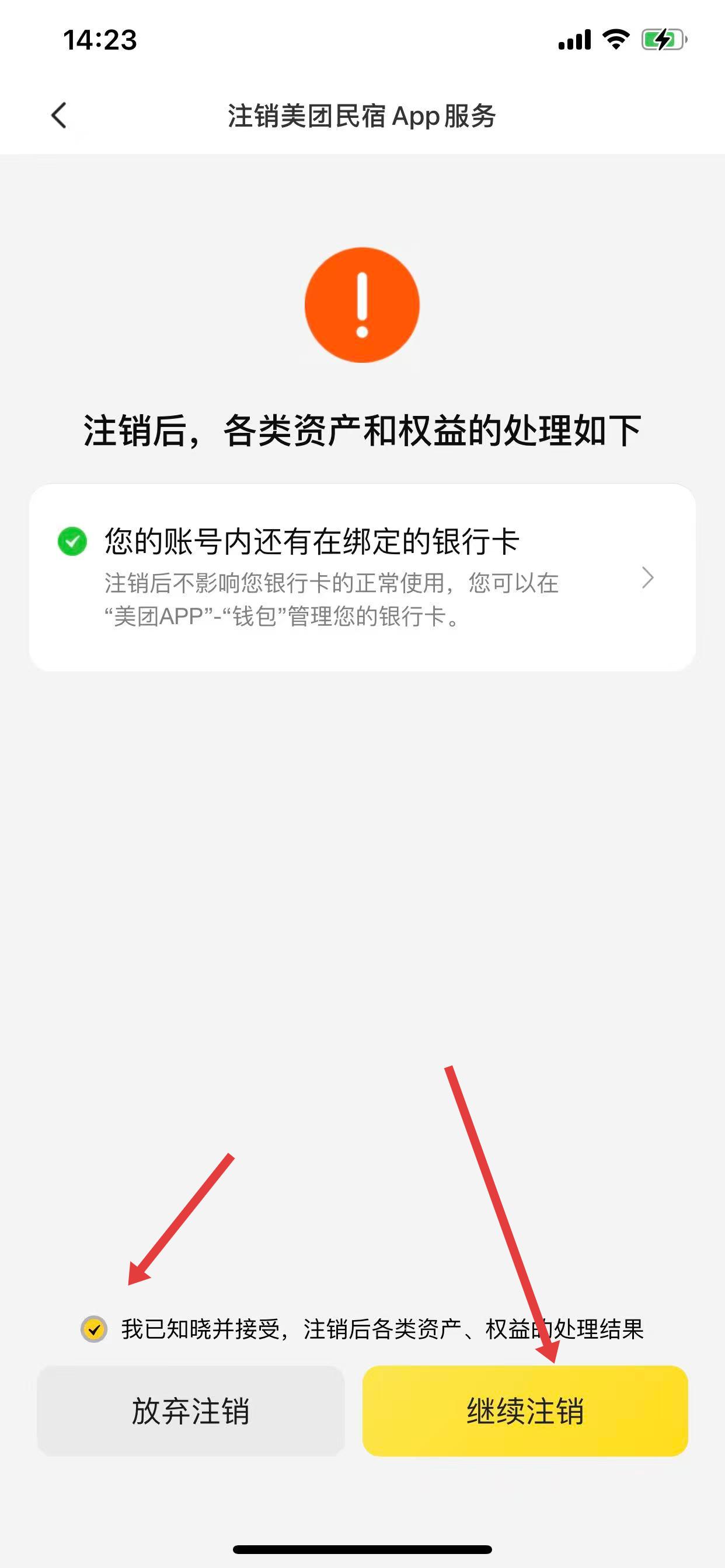 6、确认账号内资产和权益处理结果,勾选我已知晓并接受,注销后各类资产、权益的处理结果,点击继续注销。