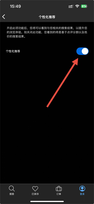 3、在个性化推荐页面,找到右侧的功能开关按钮,点击该开关按钮,即可完成个性化推荐功能的关闭操作。