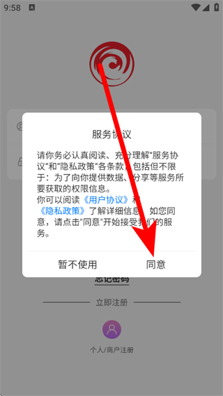 1、在服务协议弹窗中,点击同意,进入登录相关页面。