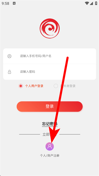 2、在登录页面,点击个人商户注册,进入注册页面。