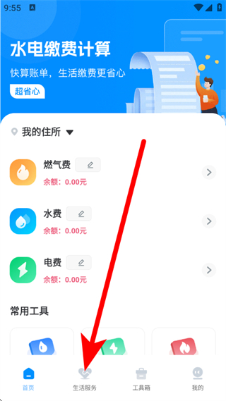 1、在水电缴费计算页面,点击底部生活服务,进入生活服务页面。