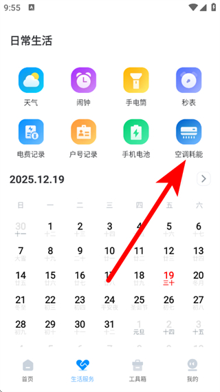 2、在生活服务页面,点击空调能耗,进入空调能耗页面。