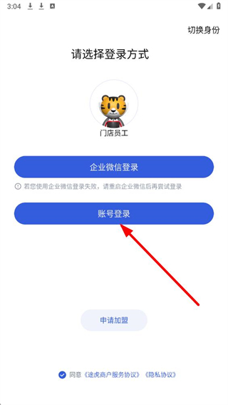 1、打开途虎养车app,在登录方式选择页面,点击账号登录选项,进入账号登录界面。
