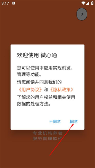1、在欢迎使用微心通弹窗中,点击同意,进入微心通首页。