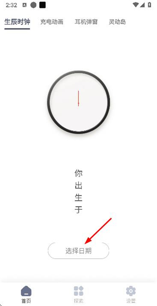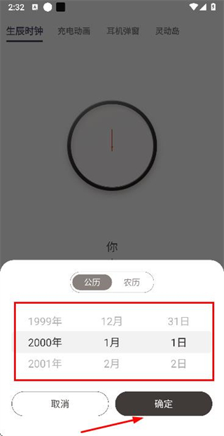 1、在生辰时钟页面点击选择日期按钮,弹出日期选择弹窗。
