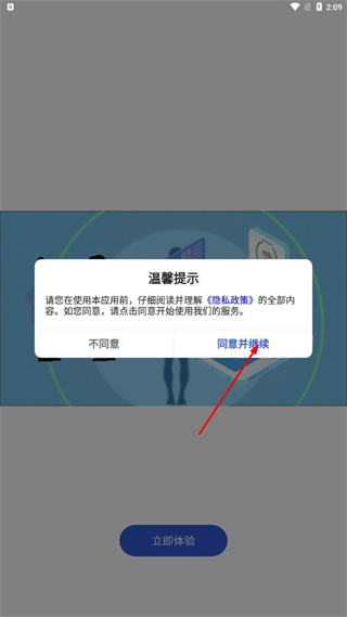 1、在温馨提示弹窗中,点击同意并继续,进入登录页面。